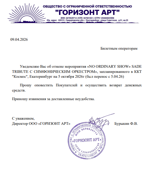 Уважаемый клиент! Спешим сообщить, что по информации, полученной от организатора, концерт «No ordinary show» sade tribute с оркестром», запланированный на 5 октября 2026 года в 19:00 в Киноконцертном театре «Космос», отменён. Деньги за электронные билеты вернутся автоматически в полном объёме на карту, с которой была произведена оплата. Если вы купили билет в кассе Ticketland.ru за наличный расчет или оплатили подарочной картой, то обратитесь, пожалуйста, на почту: vozvrat@ticketland.ru. С уважением, команда поддержки Ticketland