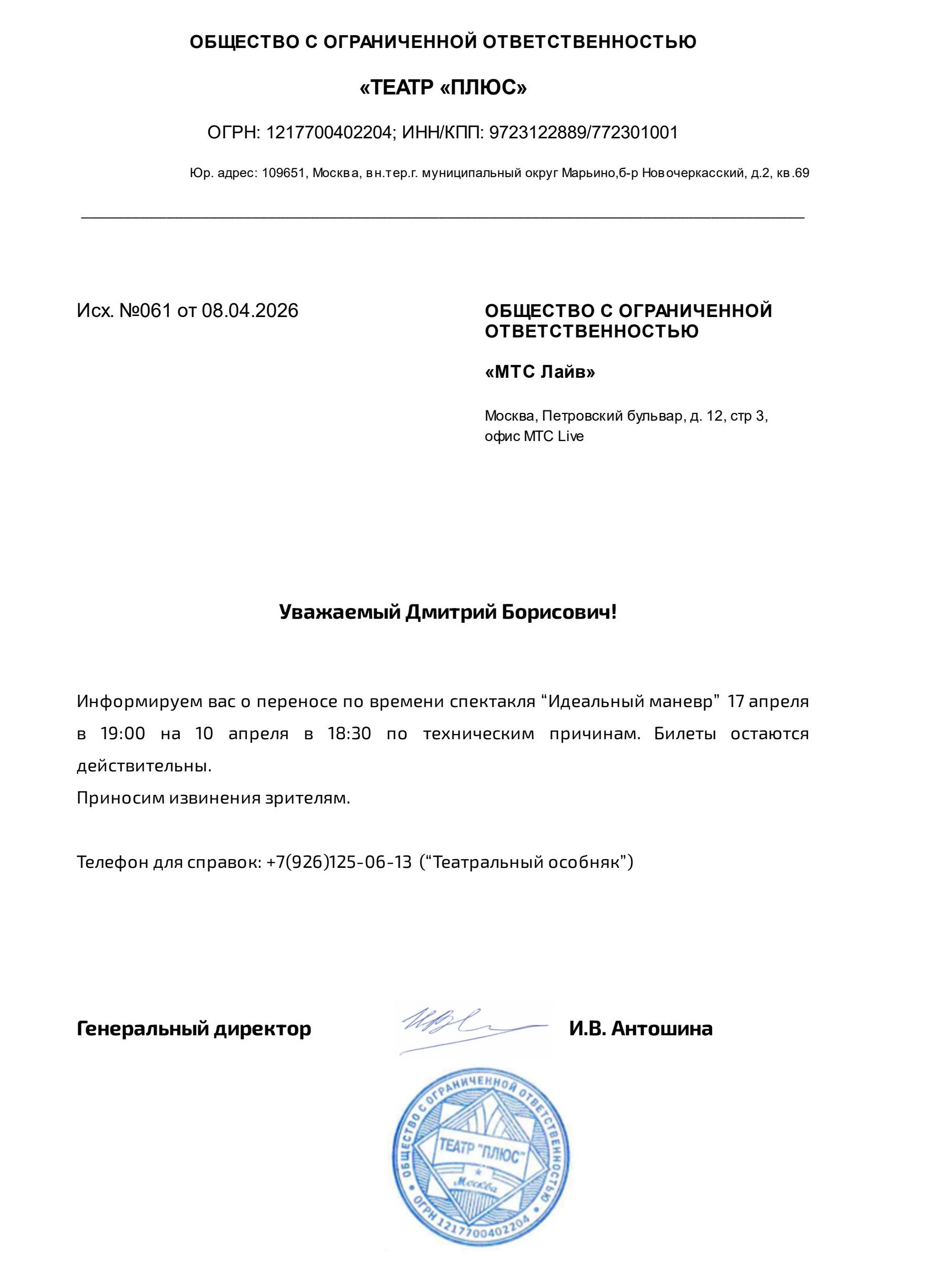 Уважаемый клиент! Спешим сообщить, что по информации, полученной от организатора, у спектакля «Кентервильское приведение», запланированного на 12 апреля 2026 года в 12:00 в молодежном театре, изменено время начала. Верное время в 11:00. Ранее приобретенные билеты действительны на новое время, обменивать их не нужно. Если вам не удобно посетить спектакль, вы можете вернуть билет по кнопке в личном кабинете во вкладке «Заказы». Деньги за электронные билеты вернутся автоматически в полном объёме на карту, с которой была произведена оплата. Если вы купили билет в кассе Ticketland.ru за наличный расчет, то обратитесь, пожалуйста, на почту: vozvrat@ticketland.ru. С уважением, команда поддержки Ticketland.