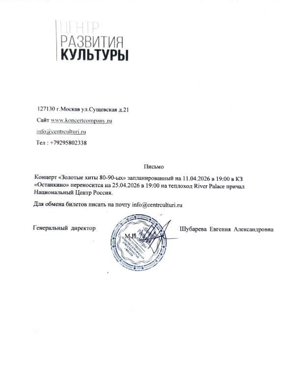 Уважаемый клиент! Спешим сообщить, что по информации, полученной от организатора, концерт «Золотые хиты 80-90», запланированный на 11 апреля 2026 года в КЗ «Останкино», переносится на 25 апреля 2026 года на теплоход River Palace, причал Национальный центр России. По всем вопросам обращайтесь, пожалуйста, к организатору мероприятия по телефону: info@centrculturi.ru. С уважением, команда поддержки Ticketland.