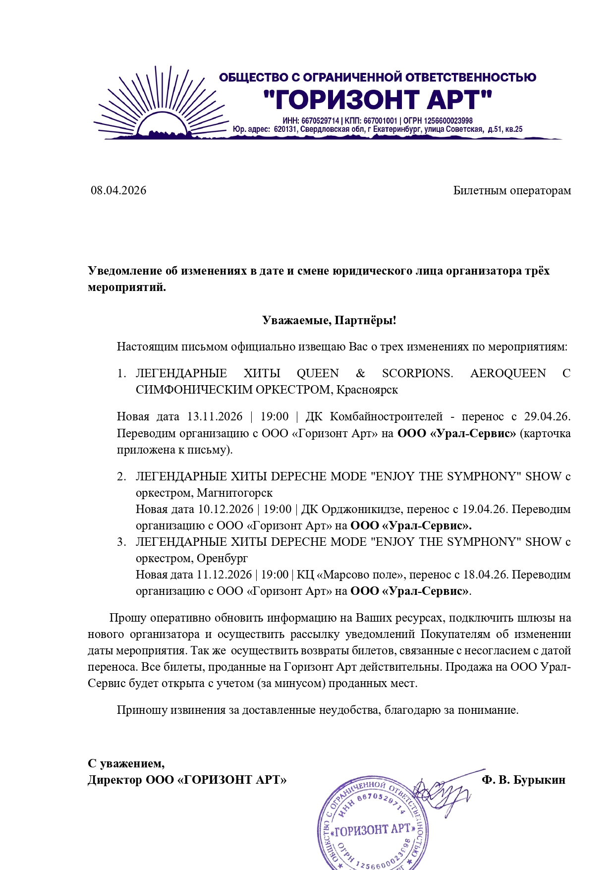 Уважаемый клиент! Спешим сообщить, что по информации, полученной от организатора, шоу «Уральские Пельмени. Летнее», запланированное на 29 мая 2026 года в 19:30 в Ледовом дворце «Кондопога», перенесено на 27 мая 2026 года, начало в 19:30. Ранее приобретенные билеты действительны на новую дату, обменивать их не нужно. Если вам не удобно посетить мероприятие в новую дату, вы можете вернуть билет по кнопке в личном кабинете во вкладке «Заказы». Деньги за электронные билеты вернутся автоматически в полном объёме на карту, с которой была произведена оплата. Если вы купили билет в кассе Ticketland.ru за наличный расчет, то обратитесь, пожалуйста, на почту: vozvrat@ticketland.ru. Письмо от организатораС уважением, команда поддержки Ticketland.