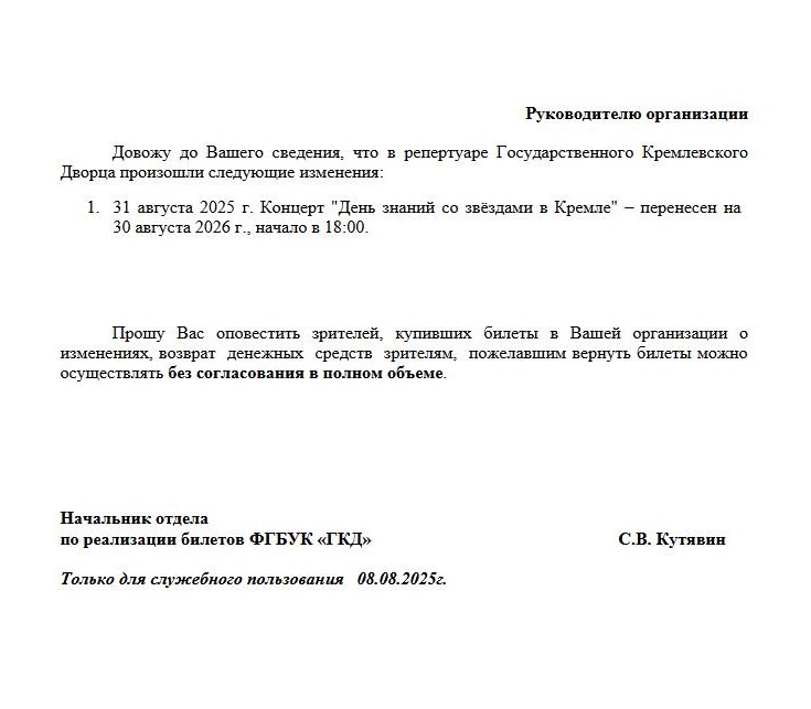 Уважаемый клиент! Спешим сообщить, что по информации, полученной от организатора, акустический концерт группы «Комната культуры», назначенный на 31 августа 2025 года в 20:00 в Зимнем театре Сочи, перенесён на 01 мая 2026 года, начало в 19:00. Ранее приобретенные билеты действительны на новую дату, обменивать их не нужно. Если вам не удобно посетить мероприятие в новую дату, вы можете вернуть билет по кнопке в личном кабинете во вкладке «Заказы». Деньги за электронные билеты вернутся автоматически в полном объёме на карту, с которой была произведена оплата. Если вы купили билет в кассе Ticketland.ru за наличный расчет, то обратитесь, пожалуйста, на почту: vozvrat@ticketland.ru. С уважением, команда поддержки Ticketland
