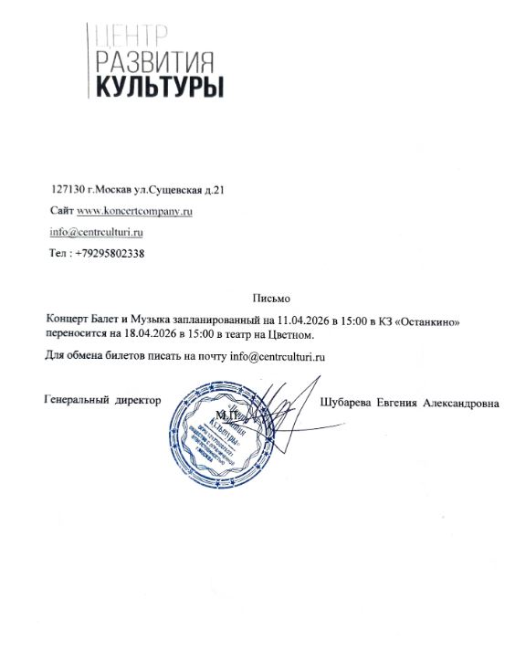 Уважаемый клиент! Спешим сообщить, что по информации, полученной от организатора, концерт «Балет и Музыка», запланированный на 11 апреля 2026 года в КЗ «Останкино», переносится на 18 апреля 2026 года в театр на Цветном. По всем вопросам обращайтесь, пожалуйста, к организатору мероприятия по телефону: info@centrculturi.ru. С уважением, команда поддержки Ticketland.