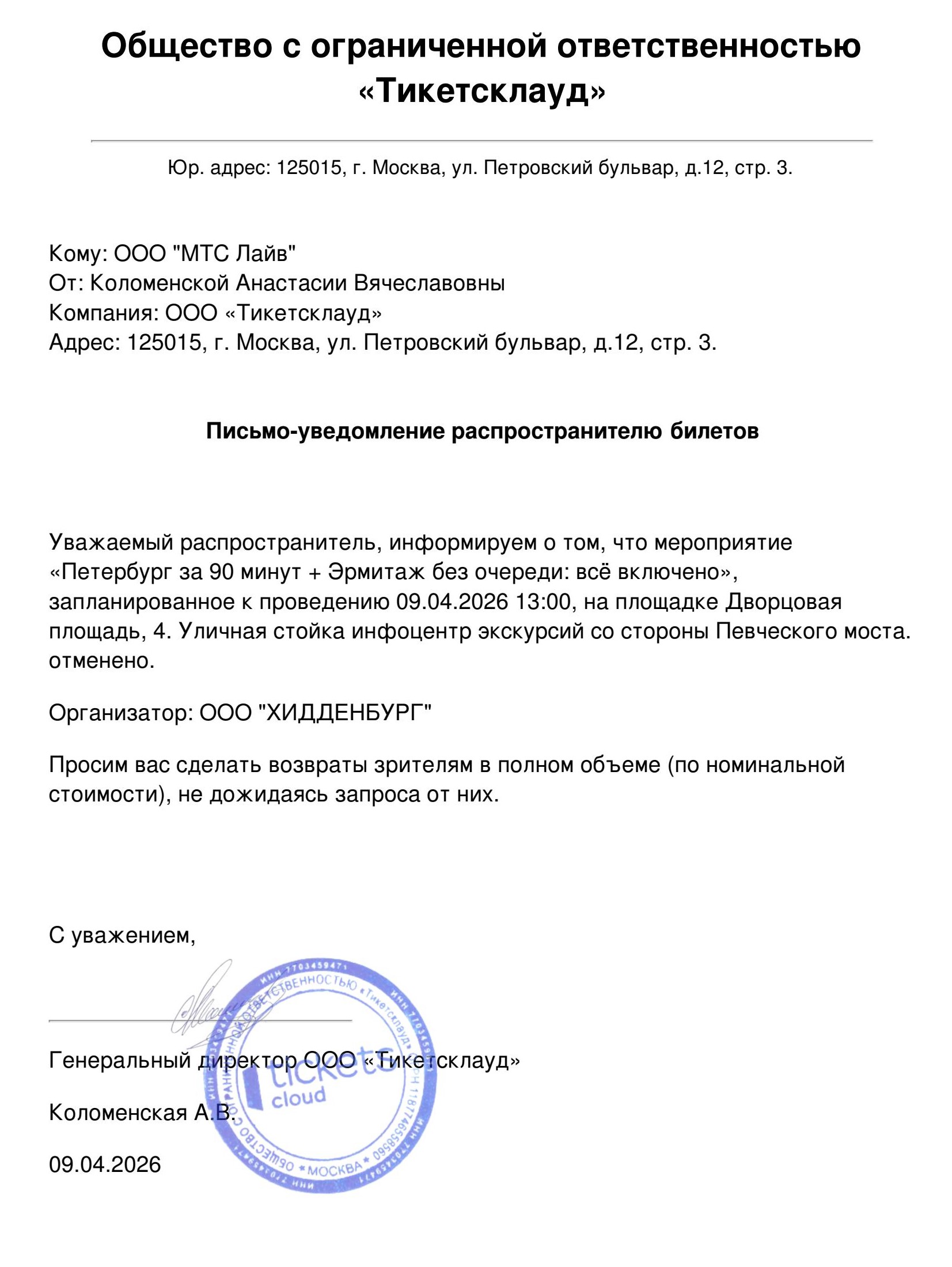 Уважаемый клиент! Спешим сообщить, что по информации, полученной от организатора, экскурсия «Морская традиция на Большом Петербургском кольце», запланированная на 11 апреля 2026 года в 11:00 на теплоходе, перенесена на 11:30 или 15:00, адрес: Английская набережная, 28. Ранее приобретенные билеты действительны на новую дату, обменивать их не нужно. Если вам не удобно посетить мероприятие в новую дату, вы можете вернуть билет по кнопке в личном кабинете во вкладке «Заказы». Деньги за электронные билеты вернутся автоматически в полном объёме на карту, с которой была произведена оплата. Если вы купили билет в кассе Ticketland.ru за наличный расчет или оплатили подарочной картой , то обратитесь, пожалуйста, на почту: vozvrat@ticketland.ru. С уважением, команда поддержки Ticketland.