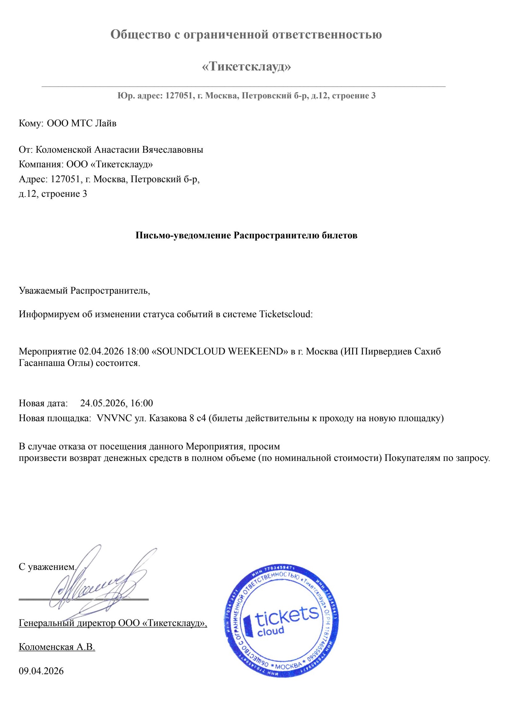 Уважаемый клиент! Спешим сообщить, что по информации, полученной от организатора, фестиваль «Soundcloud weekeend», запланированный на 2 апреля 2026 года в 18:00 в Центре городской культуры «Графит», перенесён на 26 мая 2026 года, начало в 16:00. Также у фестиваля изменено место проведения. Новое место проведения фестиваля: клуб «VNVNC» (г. Москва, ул. Казакова, 8 с4). Ранее приобретенные билеты действительны на новую дату и новую площадку, обменивать их не нужно. Если вам не удобно посетить фестиваль в новую дату и на новой площадке, вы можете вернуть билет по кнопке в личном кабинете во вкладке «Заказы». Деньги за электронные билеты вернутся автоматически в полном объёме на карту, с которой была произведена оплата. Если вы купили билет в кассе Ticketland.ru за наличный расчет, то обратитесь, пожалуйста, на почту: vozvrat@ticketland.ru. С уважением, команда поддержки Ticketland.
