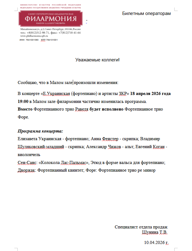 Уважаемый клиент! Спешим сообщить, что по информации, полученной от организатора, у концерта «Е. Украинская (фортепиано) и артисты ЗКР, аб-т № 1», запланированного на 18 апреля 2026 года 19:00 в филармонии, заменена программа концерта. Актуальную программу концерта вы можете посмотреть по ссылке Ранее приобретенные билеты действительны, обменивать их не нужно. Если вы не хотите посетить новое мероприятие, вернуть билет можно по кнопке в личном кабинете во вкладке «Заказы». Деньги за электронные билеты вернутся автоматически в полном объёме на карту, с которой была произведена оплата. Если вы купили билет в кассе Ticketland.ru за наличный расчет или оплатили подарочной картой , то обратитесь, пожалуйста, на почту: vozvrat@ticketland.ru. С уважением, команда поддержки Ticketland