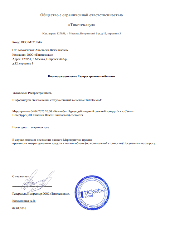 Спешим сообщить, что по информации, полученной от организатора, концерт Кая Метова, запланированный на 19 апреля 2026 года во Дворце молодежи, перенесён на 12 июня 2026 года. Ранее приобретенные билеты действительны на новую дату, обменивать их не нужно. Если вам не удобно посетить мероприятие в новую дату, вы можете вернуть билет по кнопке в личном кабинете во вкладке «Заказы». Деньги за электронные билеты вернутся автоматически в полном объёме на карту, с которой была произведена оплата. Если вы купили билет в кассе Ticketland.ru за наличный расчет или оплатили подарочной картой , то обратитесь, пожалуйста, на почту: vozvrat@ticketland.ru. С уважением, команда поддержки Ticketland.