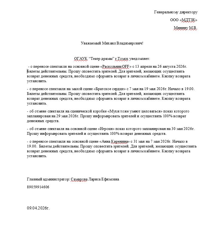 Спешим сообщить, что по информации, полученной от организатора, спектакль «РаскольникOFF», запланированный на 13 апреля 2026 года в 19:00 в Томском театре драмы, перенесен на 26 августа 2026 года, начало в 19:00. Ранее приобретенные билеты действительны на новую дату, обменивать их не нужно. Если вам не удобно посетить мероприятие в новую дату, вы можете вернуть билет по кнопке в личном кабинете во вкладке «Заказы». Деньги за электронные билеты вернутся автоматически в полном объёме на карту, с которой была произведена оплата. Если вы купили билет в кассе Ticketland.ru за наличный расчет или оплатили подарочной картой , то обратитесь, пожалуйста, на почту: vozvrat@ticketland.ru. С уважением, команда поддержки Ticketland