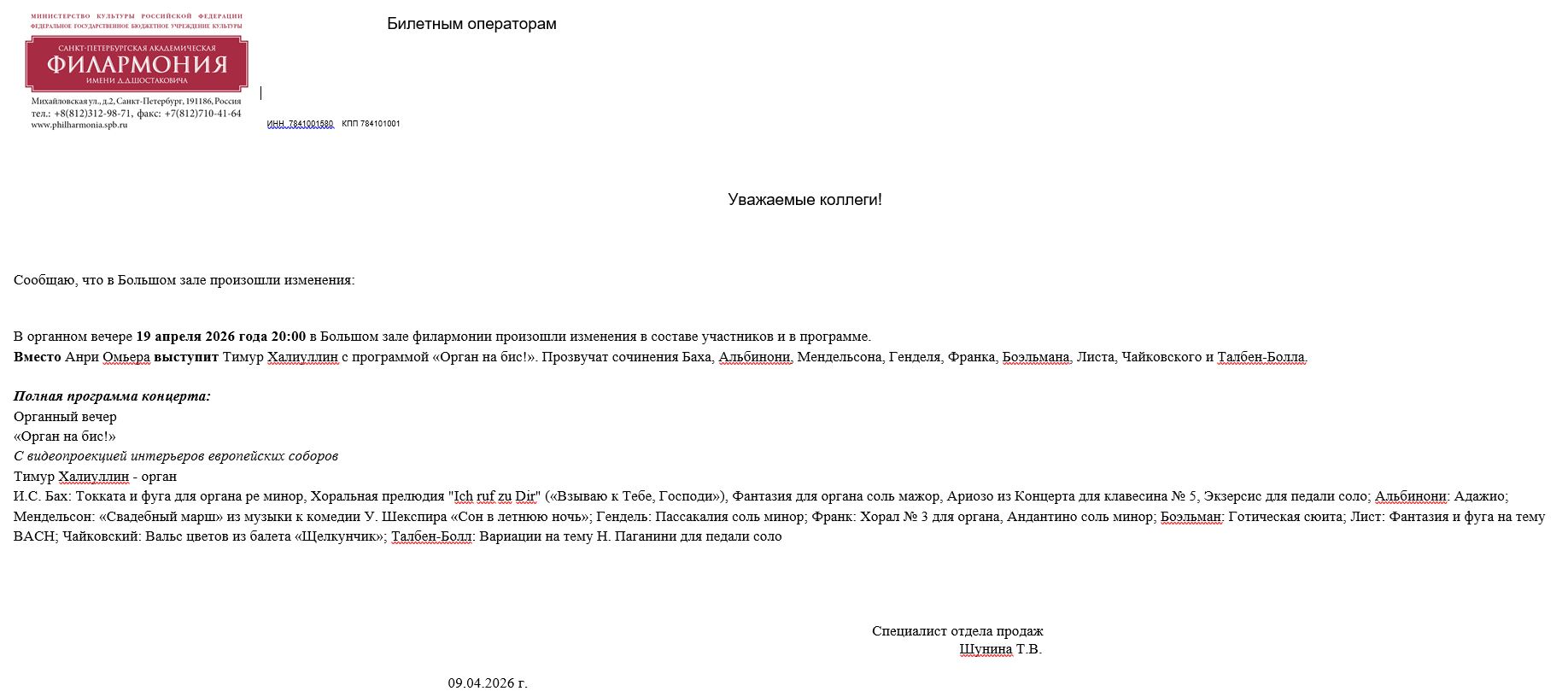 Уважаемый клиент! Спешим сообщить, что по информации, полученной от организатора, в программе концерта «Органный вечер Т. Халиуллин», запланированный на 19 апреля 2026 года в 20:00 в Филармонии (Большой зал),произошли изменения. Вместо Анри Омьера выступит Тимур Халиуллин с программой «Орган на бис!». Прозвучат сочинения Баха, Альбинони, Мендельсона, Генделя, Франка, Боэльмана, Листа, Чайковского и Талбен-Болла. Подробности в письме. Ранее приобретенные билеты действительны, обменивать их не нужно. Если вы не хотите посетить мероприятие, вернуть билет можно по кнопке в личном кабинете во вкладке «Заказы» ( до 2026-04-19 20:00). Деньги за электронные билеты вернутся автоматически в полном объёме на карту, с которой была произведена оплата. Если вы купили билет в кассе Ticketland.ru за наличный расчет, то обратитесь, пожалуйста, на почту: vozvrat@ticketland.ru. С уважением, команда поддержки Ticketland