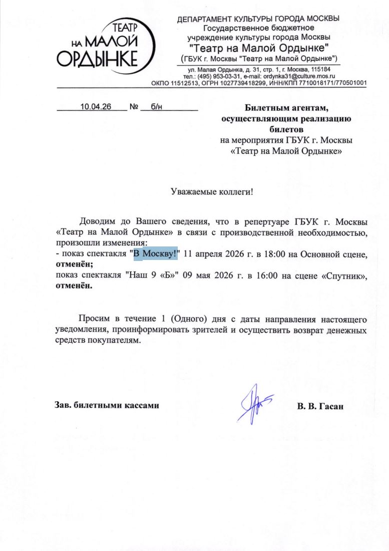 Уважаемый клиент! Спешим сообщить, что по информации, полученной от организатора, спектакль «В Москву!», запланированный на 11 апреля 2026 года в Театре на Малой Ордынке, отменен. Деньги за электронные билеты вернутся автоматически в полном объёме на карту, с которой была произведена оплата. Если вы купили билет в кассе Ticketland.ru за наличный расчет или оплатили подарочной картой , то обратитесь, пожалуйста, на почту: vozvrat@ticketland.ru. С уважением, команда поддержки Ticketland